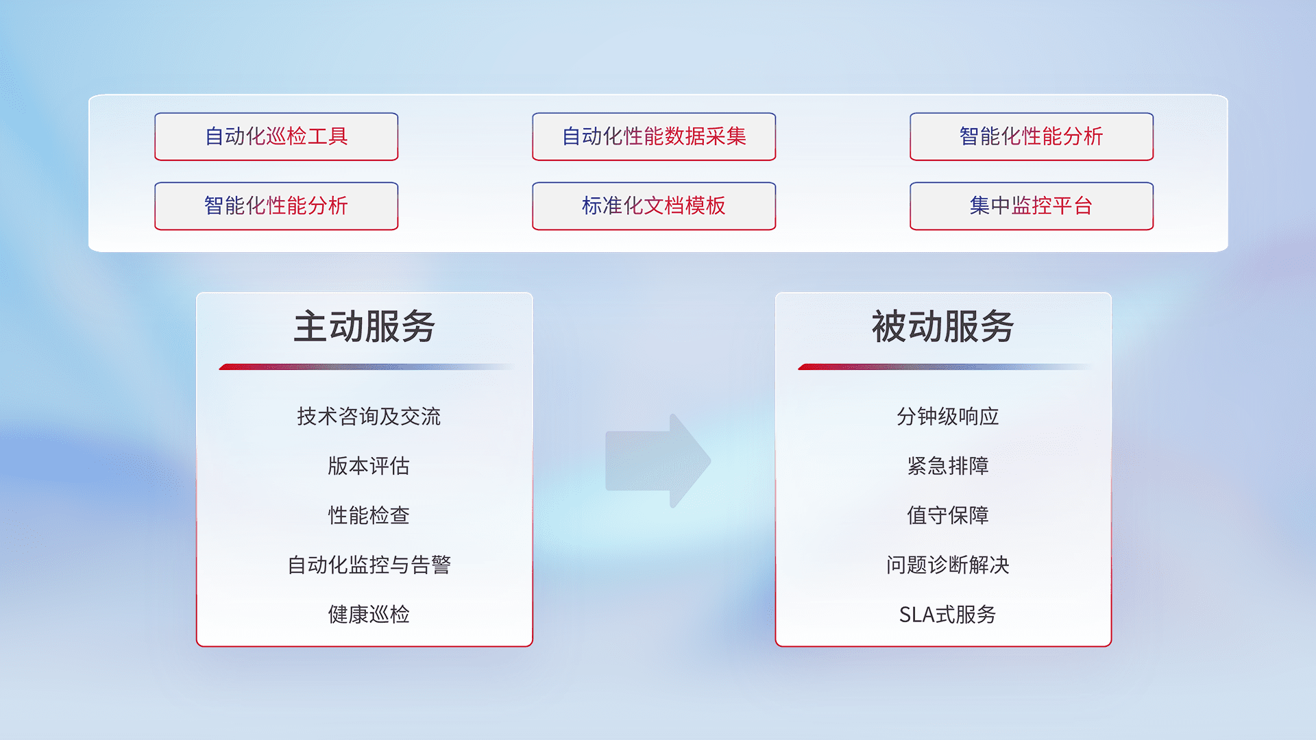 智能化工具和标准化文档,,,,保障服务质量,,,,提供主动服务(包含技术咨询、、、版本评估、、性能检查、、自动化监控与告警、、、健康巡检)和被动服务包含(分钟级响应、、、紧急排障、、、、值守保障、、、、问题诊断解决、、、、SLA服务)。。。。